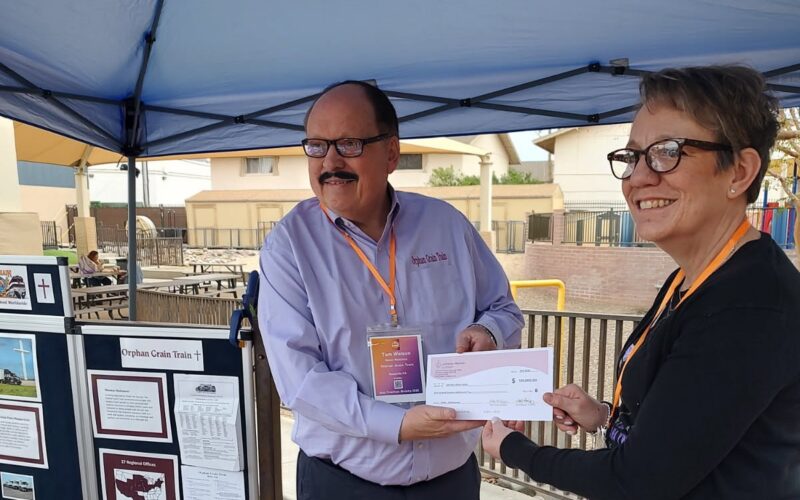 Tom Watson, Orphan Grain Train donor relation specialist, accepts a Lutheran Women in Mission (LWML) grant for Orphan Grain Train from Anne Hartman, LWML National Vice-President of Gospel Outreach. The grant check is in the amount of $100,000. This e...