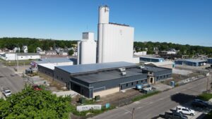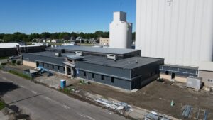 Breaking ground started in June of 2023 along with many electrical poles being taken down around the site so that cables can be put underground. After the ground was prepared, the structural beams were being put in place and soon the walls were being attached. The grain bins even got a face lift with fresh paint.